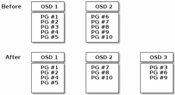 下面的图示描述了部分的PG(非全部PG)从已有的OSD 1,OSD 2上迁移到新OSD 3上达到数据再平衡的过程(因为对大型集群的影响要小得多,所以过程相对粗略一些)。 即使在再平衡过程中,CRUSH也是稳定的。大部分的PG仍然保留着原始的配置,由于新增加了OSD,所以每个OSD都会增加一些(可用的)容量,因此在重新平衡完成后,新的OSD上也不会出现负载峰值的情况。