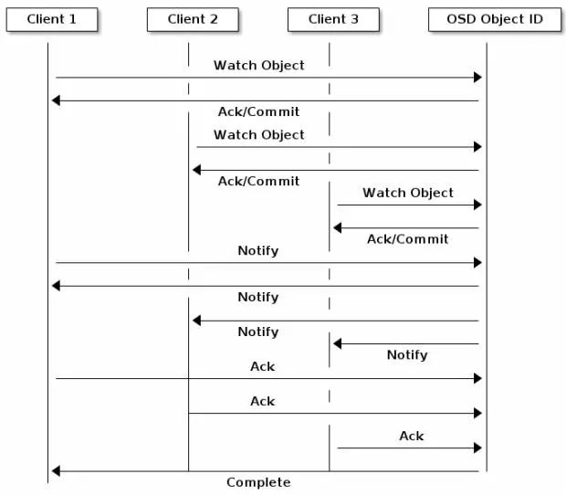 Ceph客户端可以为对象注册持久的关注点,并保持与主OSD的会话开启。客户端可以向所有观察者发送通知消息和数据,并在观察者收到通知时接收通知。这使得客户端可以使用任何对象作为同步/通信的通道。