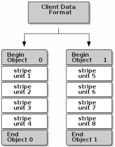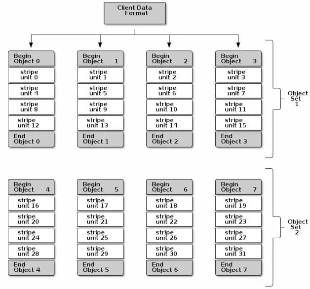 (译者注:例如每一个对象存储上限是4M,同时每一个单元块占1M,这时我们有一个8M大小的文件想进行存储,这样前4M存储在对象0中,后4M就创建另一个对象1来存储)