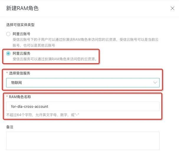 在弹出的新建RAM角色页面中,选择阿里云服务,选择受信服务物联网(这里只是以物联网受信服务为模板,后面进行修改),在RAM角色名称中输入:for-dla-cross-account(名字可以自己定义)。