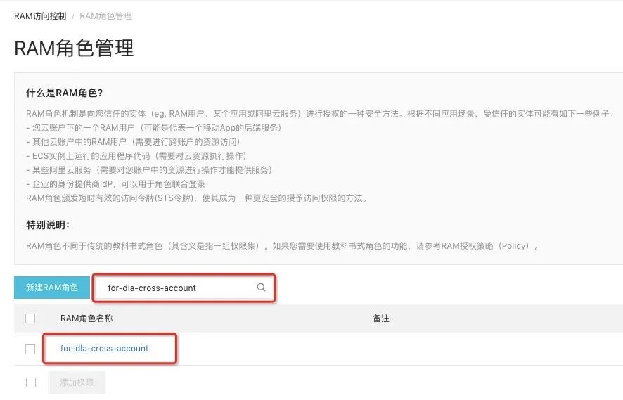 仍然在RAM中,在RAM角色管理页面,输入步骤一中创建好的RAM角色名称for-dla-cross-account(如果您自己定义了名称,输入相应名称),搜索到对应角色。
