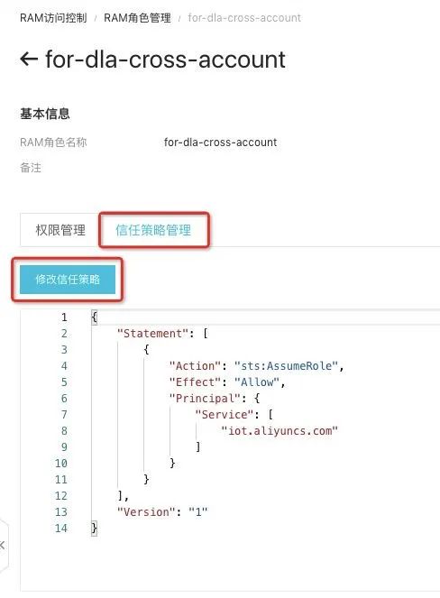 点击for-dla-cross-account(或者您实际的角色名称),进入后,选择信任策略管理,点击修改信任策略。