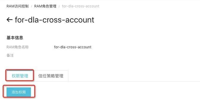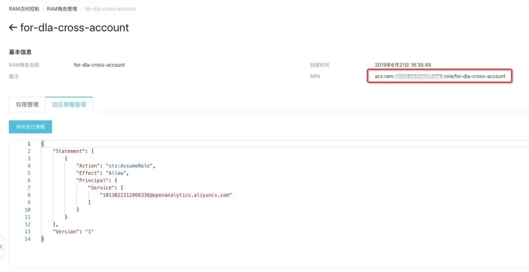 在如下页面右上角,复制ARN的URL:acs:ram::2222222222:role/for-dla-cross-account(以您实际显示的URL为准,其中2222222222是云账号B的云账号),后面在DLA中建schema时要用到。
