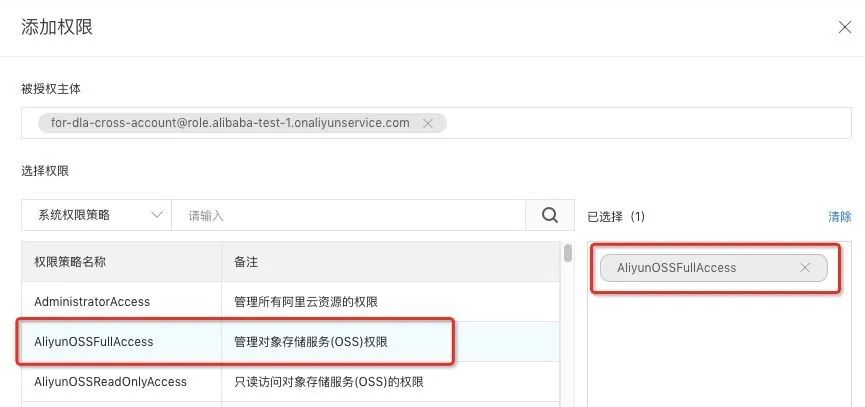 选择AliyunOSSFullAccess,如果只是查询,也可以选择AliyunOSSReadOnlyAccess。因为后续可能在DLA中执行INSERT OVERWRITE操作,建议这里选择AliyunOSSFullAccess。确定保存。