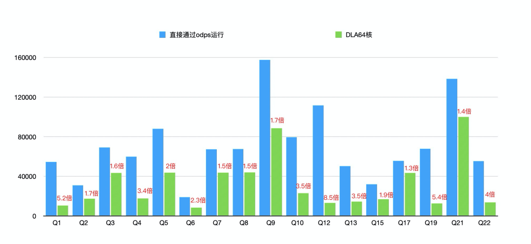 测试方法:分别在MaxCompute中直接执行SQL,和通过DLA64核256GB的CU执行SQL,比较延时。