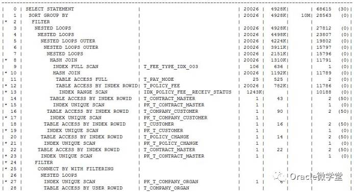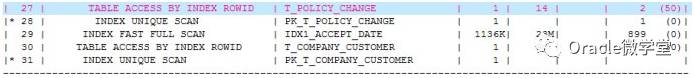 从执行计划上看,CBO对这儿子查询进行了unnest,因为通常情况下CBO认为子查询被unnest之后性能好。filter,这时我们需要确定子查询返回多少行,经过确认,该子查询返回只返回1行,对于子查询,如果它返回数据很少(这里返回1行),那么可以让它走filter, 而且filter基本上是在SQL最后去阶段执行,这样t_policy_fee就可以走索引了,所以我给这个子查询加了个HINT,禁止子查询扩展。