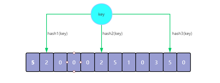 如下图所示,获取到3个hash位置上的计数值:{2, 2, 5},取所有值中的最小值返回