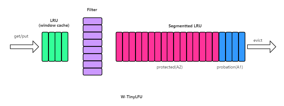 前端是一个小的LRU(window cache);window cache淘汰后,会送到Filter过滤;过滤通过后,元素存储到一个大的Segmented LRU缓存里。Window LRU,它的容量只占据1%的总空间,它的目的就是用来存放短期突发访问记录。存放主要元素的Segmented LRU(SLRU)是一种LRU的改进,主要把在一个时间窗口内命中至少2次的记录和命中1次的单独存放,这样就可以把短期内较频繁的缓存元素区分开来。具体做法上,SLRU包含2个固定尺寸的LRU,一个叫Probation段A1,一个叫Protection段A2。新记录总是插入到A1中,当A1的记录被再次访问,就把它移到A2,当A2满了需要驱逐记录时,会把驱逐记录插入到A1中。W-TinyLFU中,SLRU有80%空间被分配给A2段。