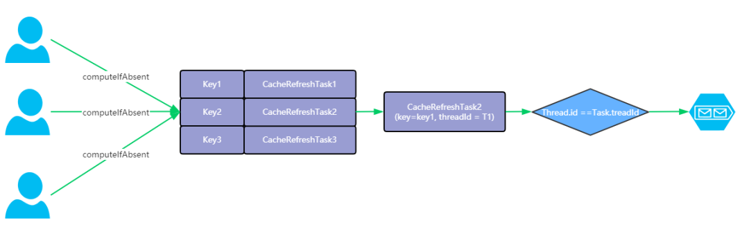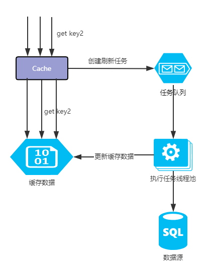 当缓存在访问时判断需要被刷新时. 会创建一个刷新任务异步去刷新,不会阻塞当前线程获取缓存的操作。
