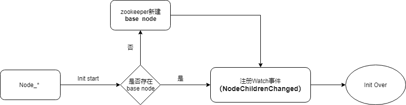 每个应用节点在启动初始化时会判断当前是否需要创建base Node ,并为其注册EventType.NodeChildrenChanged 事件的Watcher,各节点利用Watch 事件机制,用于监听同步命令。流程图如下:
