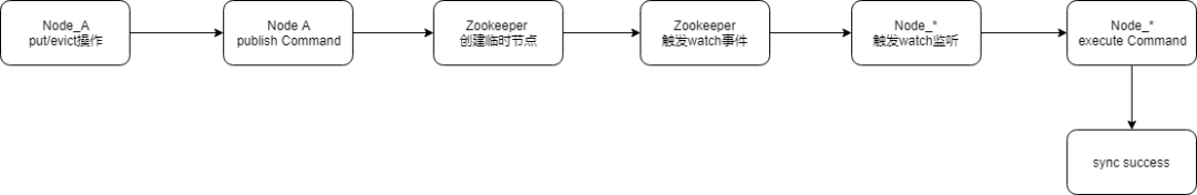接下来,各缓存节点就可以进行Command同步,当有节点的缓存数据更新成功时,会发出publish sync Command命令至Zookeeper,此时会触发NodeChildrenChanged Watch事件。其他节点监听到事件触发,可接收到sync Command,整体同步流程图如下: