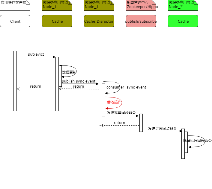 至此,总结到当前方案存在两个比较大的问题,一是多节点缓存同步命令容易形成消息风暴 ,二是单节点数据更新与发送数据同步命令操作偶合过重,所以在多节点缓存数据同步策略的实现中我们使用了异步蓄池操作方案,通过开源的Disruptor环形队列异步处理框架对当前节点的数据更新操作与发送缓存同步命令进行操作异步处理,同时对要发出的缓存同步命令消息进行蓄池批量发送,引入Disruptor之后最终的缓存数据节点同步操作。时序图如下: