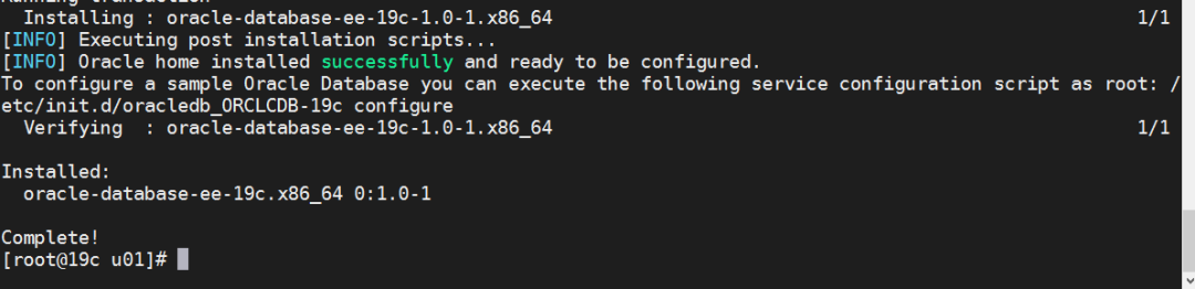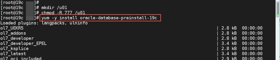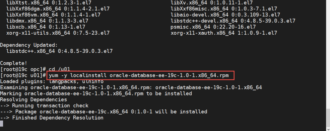 我将下载好的rpm放在/u01下面,然后通过root用户使用yum的方式进行安装,安装大概需要5-10分钟的时间。