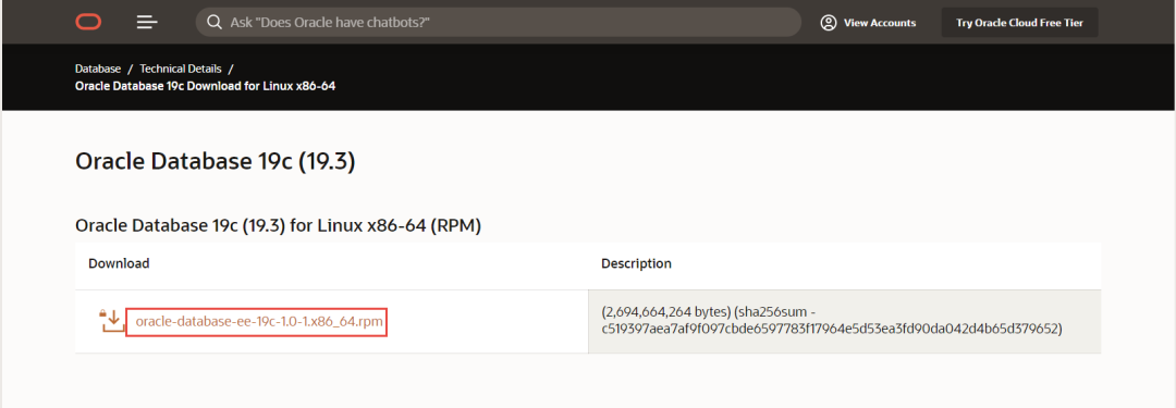 您可以来到我公司官网下载19.3数据库rpm包,地址如下:https://www.oracle.com/database/technologies/oracle19c-linux-downloads.html