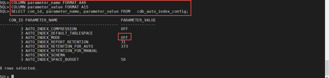我们通过观察发现“AUTO_INDEX_MODE”是OFF状态,说明还没有启动自动索引功能。