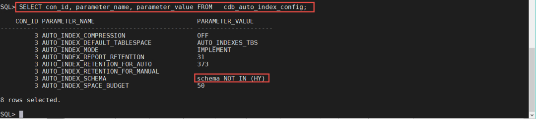 默认情况下,所有的schemas都将被使用自动索引功能,但如果您想有针对性地启用自动索引功能,可以通过DBMS_AUTO_INDEX.CONFIGURE这个存储过程进行配置。我们首先看看在没有进行特定schema配置之前的自动索引状态。