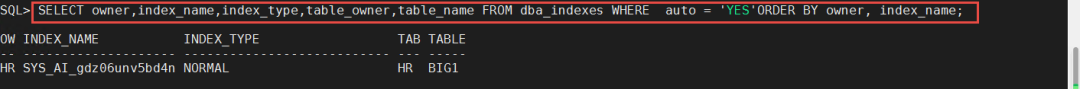 通过观察上面的结果发现,系统自己创建了索引,名字是以SYS_AI开头的,AI就是自动索引的意思吧。