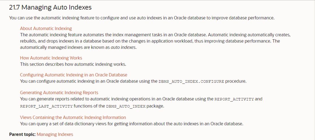 关于更多的自动索引的信息,您可以查询Oracle官方文档。https://docs.oracle.com/en/database/oracle/oracle-database/19/admin/managing-indexes.html#GUID-D1285CD5-95C0-4E74-8F26-A02018EA7999