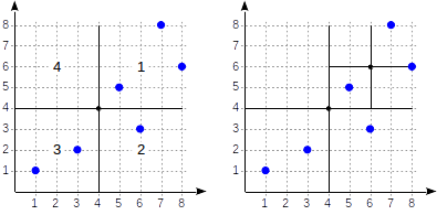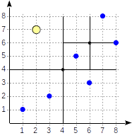 叶节点(8,6)和(7,8)的列表对应于第一象限,其中只有点(7,8)满足查询条件。对第四象限的引用为空。在内部节点(4,4)中,对第四象限的引用也为空,这样就完成了搜索。