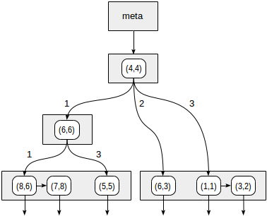象限的编号如第一幅图所示。为了确定起见,让我们从左到右按照完全相同的顺序放置子节点。下图显示了这种情况下可能的索引结构。每个内部节点最多引用四个子节点。