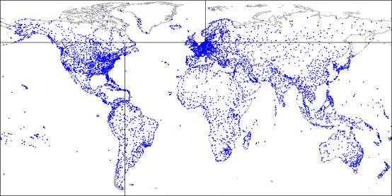这是图示的样子,是通过示例数据库(openflights.org网站中的机场«airports»)扩充的。顺便说一下,最近我们发布了一个新版本的数据库,其中,我们用一个«point»类型的字段替换了经度和纬度。