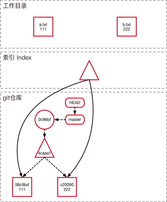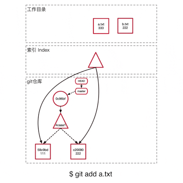 将a.txt的内容从111修改成333,此时如上图可以看到,此时索引区域和git仓库没有任何变化。