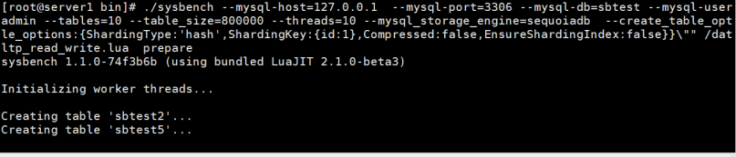 ./sysbench --mysql-host=127.0.0.1 --mysql-port=3306 --mysql-db=sbtest--mysql-user=sdbadmin --mysql-password=xxxxxx --tables=10 --table_size=800000--threads=10 --mysql_storage_engine=sequoiadb--create_table_options="comment=\"sequoiadb:{table_options:{ShardingType:'hash',ShardingKey:{id:1},Compressed:false,EnsureShardingIndex:false}}\""/data/sysbench1.1/share/sysbench/oltp_read_write.lua prepare