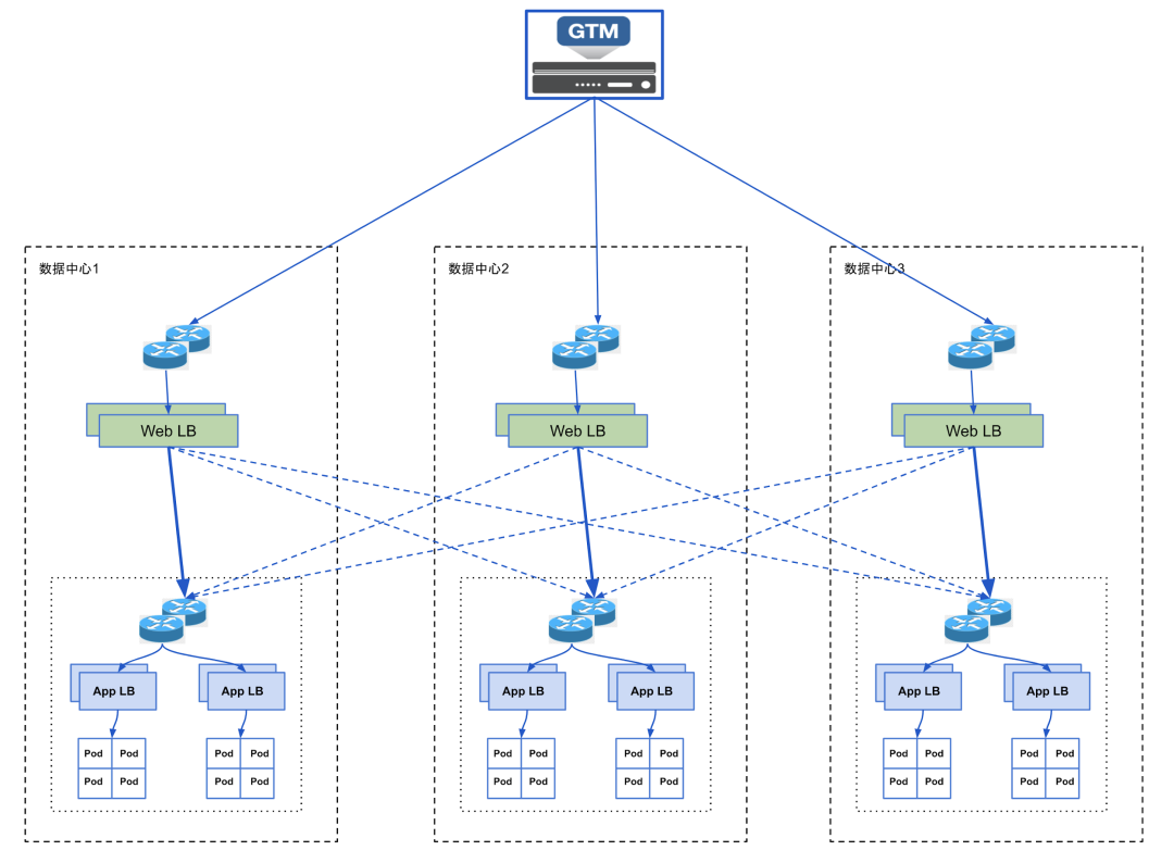 Web层LB:这层LB连接的是App层的VIP,VIP的协议是SSL,并启用轮询算法,配置有少量L7规则,同时根据99:1:1的权重将流量下发到三个数据中心的App层VIP。