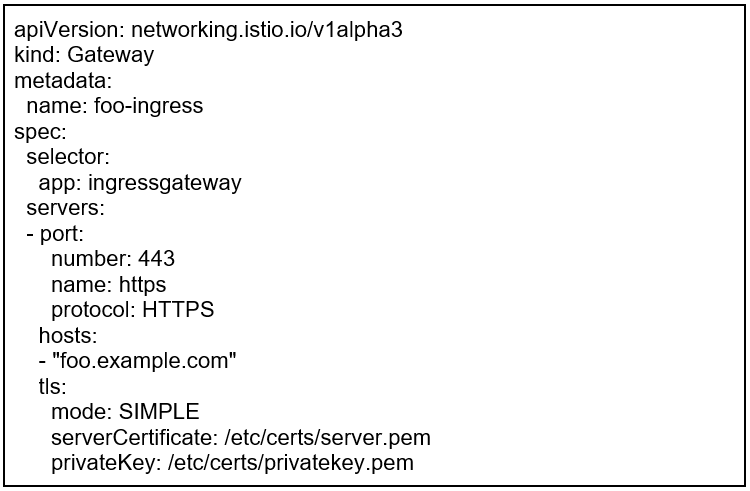 它的主要作用是用来描述访问网关的服务端口、协议以及证书等信息。比如下面的foo-ingress Gateway资源定义了“访问网关服务foo.example.com协议是HTTPS,端口是443以及相关的证书和私钥”,最终这些配置(包括证书)会由Istio的Discovery Service生成Envoy的配置,再通过XDS接口推送到IngressGateway Pods。而IngressGateway Pods本质上就是一个Envoy集群,或者称L7 Cluster,作为数据面,来处理所有通过网关进入网格的流量。