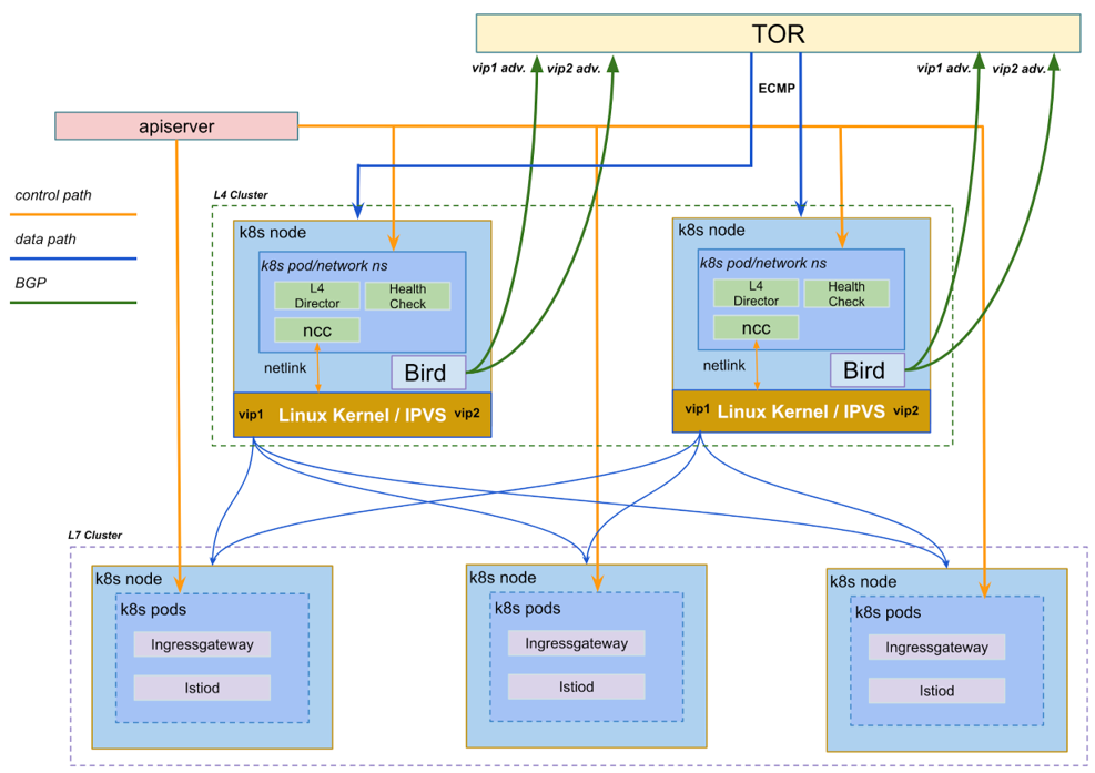 ⑥支持Direct Server Return (DSR),即客户端请求会经过L4集群,服务端响应不会经过。