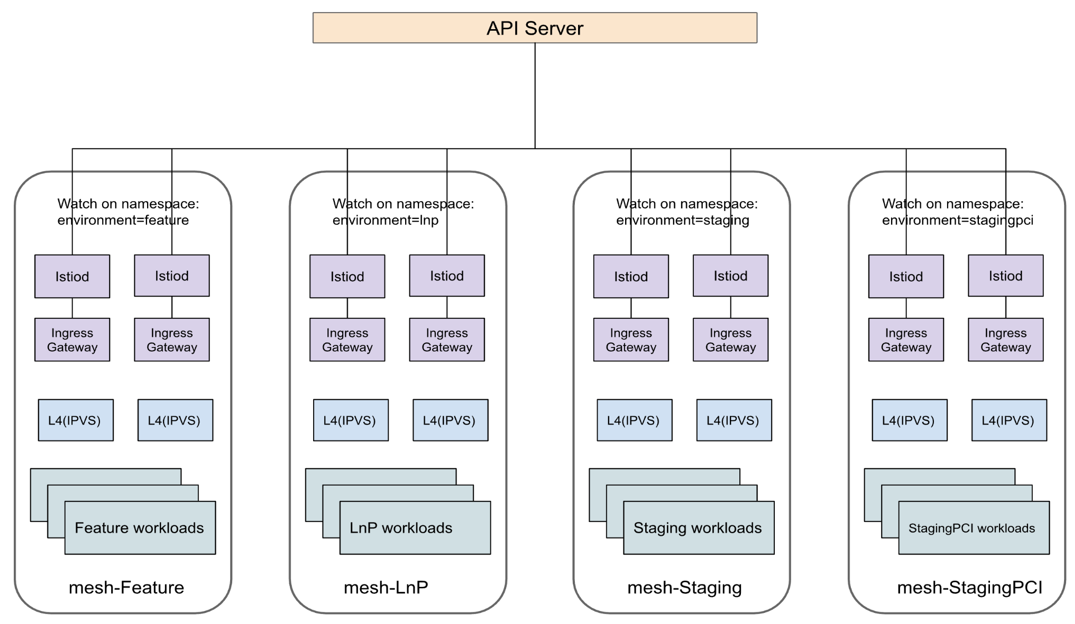 因为一个k8s集群会同时支持多个环境,所以这里采取了单个k8s集群部署多套Istiod,IngressGateway和L4集群,实现不同环境控制面数据面隔离,主要架构如图4.1。