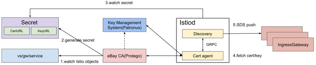 社区对网关证书的做法是通过Secret保存证书和私钥,Istio的Secret Discovery Service最终会将证书和私钥推送到IngressGateway。然而,eBay信息安全的规定是私钥不能存盘,所以社区Secret的实现不能满足安全要求。