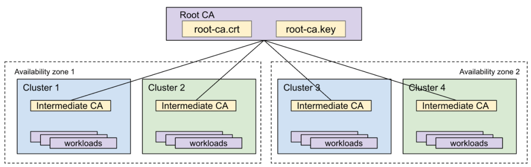我们利用一个自签根证书为每个Istio集群签发中间证书,这也是社区推荐的做法,Istiod充当了网格内部的CA,网格内部Sidecar的证书是Istio维护的,证书有效期是24小时,也就是每天会更新一次。Istio多集群的证书管理如图4.3所示: