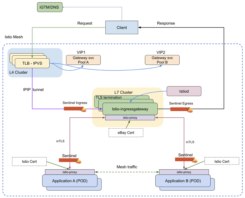 这种模式适用于对可用性要求不高场景,比如Dev/LnP/Staging Secure测试环境,同时支持API Gateway和Mesh的应用场景,支持为应用配置独立Gateway VIP,并且不同环境配置专有L4/L7集群,实现控制面和数据面的隔离。此外,IngressGateway还集成了eBay的软件防火墙(Sentinel),默认会阻止所有访问。防火墙会保护Ingress/Egress流量,同时也会保护进入Pod的流量,具体的实现是通过在节点创建IPtables规则。这也是我们第一次实现全链路加密并且有防火墙的集成测试环境,由此我们可以完整的模拟生产环境,具体架构图如图4.4: