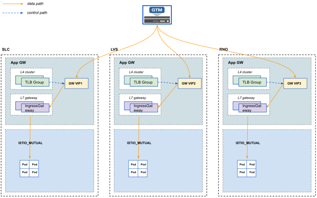通常eBay生产应用会跨三个数据中心部署,而实际的情况可能不止3个Web和3个App VIP。为了实现更高的可用性,应用会在每个数据中心的多个可用区分别部署,有可能是9个Web和9个App VIP。又由于eBay应用的微服务架构,导致消耗了更多的VIP和硬件负载均衡设备。此外,数据中心内部服务间的调用以南北流量为主,即请求需要经过负载均衡设备,这种服务间的调用也是导致负载均衡设备数据面过载的一个很重要的原因。