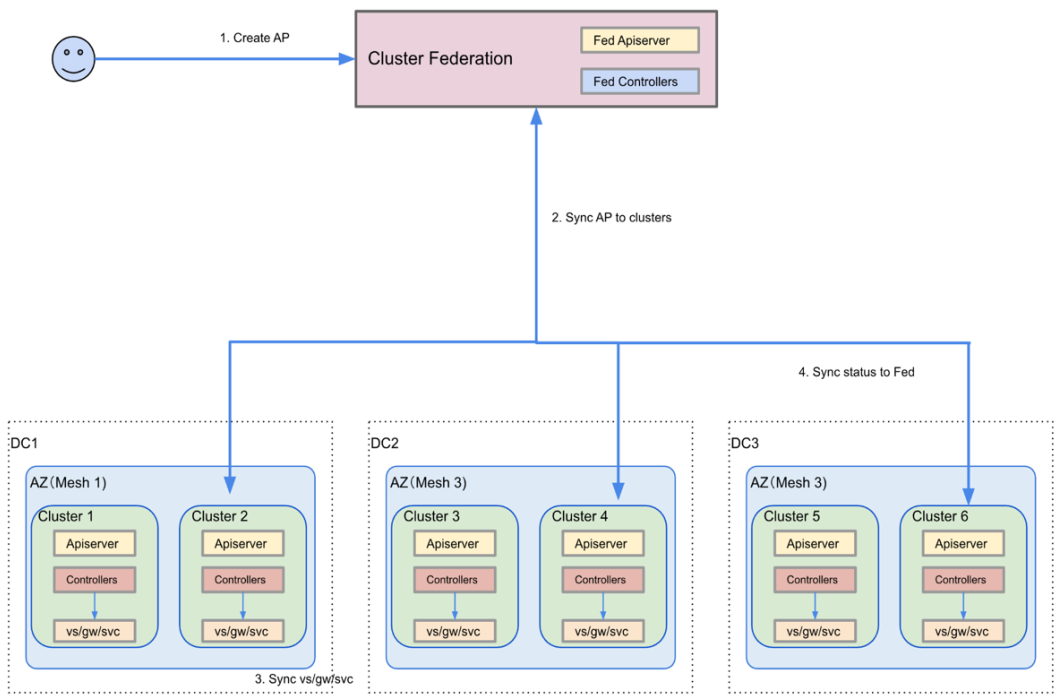 Istio中定义了多种资源管理L4到L7的流量,同时Kubernetes中有Service以及eBay内部定义的TLB相关资源。为了便于统一管理这些资源,我们定义了AccessPoint资源,这也是一个联邦资源,用户只需要通过Federated APIServer创建一个AccessPoint,相应的联邦控制器会将资源同步到用户指定的集群,而集群中的控制器会进一步创建在AccessPoint定义的Istio/Kubernetes资源。