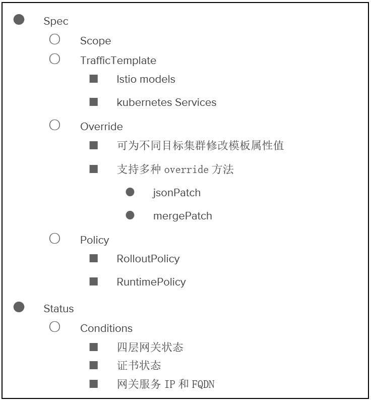 下面的表格是AccessPoint资源的主要SPEC,里面主要封装了Isito和Kubernetes的资源,同时能指定资源需要同步到的集群。并且,该SPEC能够在不同的集群中通过修改模板属性值来进行定制。此外,还能在SPEC中指定流量策略,比如运行时的策略、不同数据中心的流量权重以及发布策略,主要是指在执行L7规则变更的过程中能支持对不同可用区逐个变更。最后一部分是状态的收集和汇总,每个集群的网关VIP、证书、FQDN的状态都会同步到Federated APIServer,能够给用户提供一个全局的状态。
