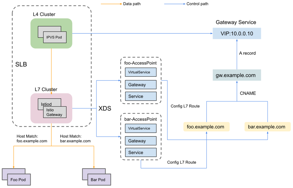 同时,会在网关配置Wildcard证书,通配所有的CNAME。L7的规则主要在VirtualService指定如下的主机名匹配的转发规则: