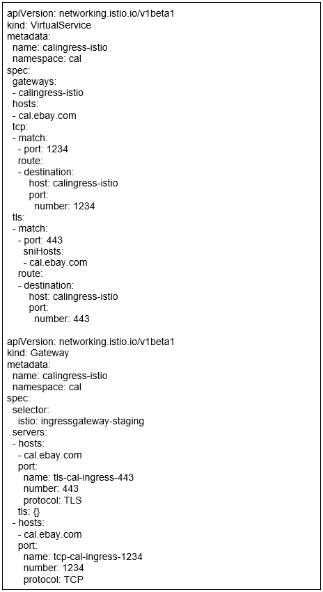 在这种模式中,Istio作为一个API Gateway,能够与原有的硬件负载均衡架构无缝替换,eBay应用以及CAL服务器几乎不需要做任何修改,只需要创建一个新的Gateway VIP,更新到GTM,并且停用原来的硬件负载均衡VIP。目前这套方案应用到了CAL的集成测试环境,具体配置如下: