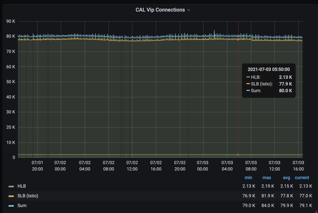 图6.2是基于Istio网关的CAL IngressGateway活跃连接数。因为这里的IPVS是工作在IPIP Tunnel模式,所以TCP的连接不是建立在IPVS Pod上,而是在Ingress Gateway Pod上。这里我们可以看到Ingress Gateway的总连接数稳定在8万个。