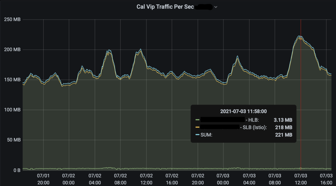 图6.3是基于Istio网关的CAL入站流量,这里我们看到总流量是150MB/s,这只是集成测试环境,而实际生产环境下总的流量会达到50GB/s。