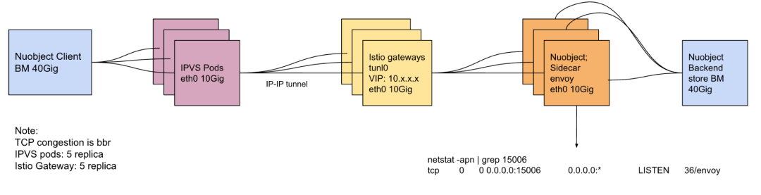 NuObject是eBay用来替换Swift的一个对象存储服务系统。这套系统会基于Isito的IngressGateway模式下实现,前期我们对这套方案实施了数据面的高吞吐压力测试,最终结果(如图6.5)是Gateway达到30Gb/s,存储后端服务器器物理机达到40Gb/s。