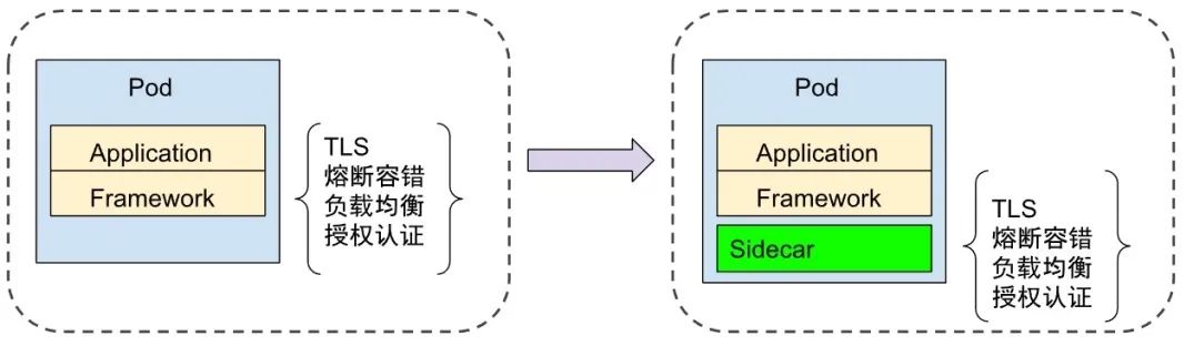 而Mesh则将TLS、负载均衡、熔断限速以及授权验证等功能进一步与框架解耦,将这一部分服务治理的功能下沉到Sidecar。同时,它还实现了与业务自身逻辑以及框架的解耦,如图6.7所示。