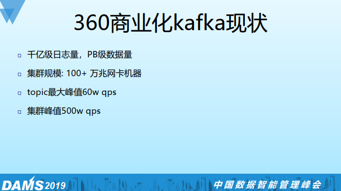 目前集群有千亿级数据量,100 多台万兆机器,单 Topic 的最大峰值 60 万 QPS,集群的峰值大概在 500 万 QPS。