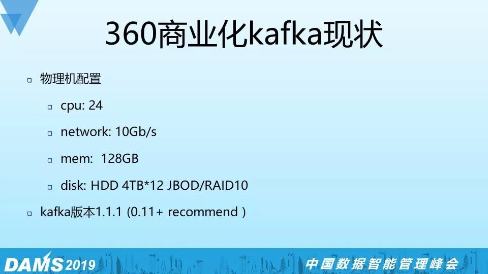 我们目前的 Kafka 版本是 1.1.1,推荐大家部署 0.11 以上的版本会好一些,这个版本对协议做了很多优化,对于后续的 2.x 版本都是兼容的。