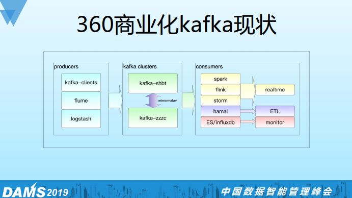 这个是我们 Kafka 上下游相关的组件,生产端主要是各种 Kafka Clients/实时服务/Flume/Logstash。消费端分为实时,离线(ETL),监控三部分。实时有 Spark/Flink/Storm 等主流框架, 离线部分我们基于 Flink 自研了一个统一落地框架 Hamal,从 Kafka 消费一遍数据就可以落地到多个下游系统(HDFS、Hbase、Redis等),可以避免重复消费。