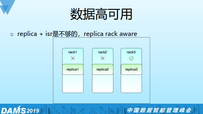 实现 Replica 的 Rack Aware,物理节点上面会有 Rack 信息,在为 Replica 分配物理节点的时候会记录已经分配的 Rack 信息。