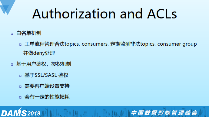 如果老集群想中途施行鉴权授权机制会比较困难,需要推各个业务去修改配置,同时切换的过程也很容易出问题。下面介绍下我们实现的一个白名单机制来解决老集群的问题,首先将老业务加入到白名单中,让新业务通过工单流程来申请 Topics 和 Consumers 两种资源权限并加到白名单里,定期监测非法(没有走工单)Topics,Consumers 资源。同时将这些资源都 Deny 掉,这样就收紧了 Topics 和 Consumer 读写权限的口子,同时原有业务不会有任何影响。