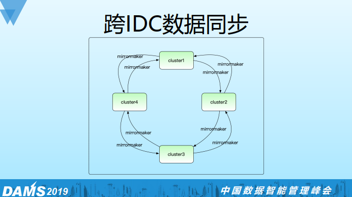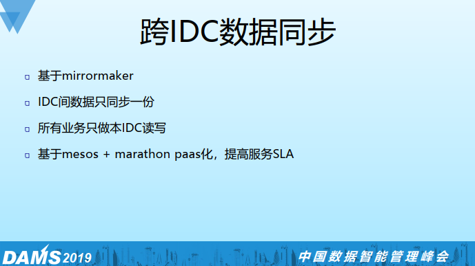 为了解决以上问题,我们统一做了跨 IDC 的数据同步服务,首先我们约定业务只能做本 IDC 的读写,不允许做跨 IDC 的读写,如果有跨 IDC 的数据需求,要向我们申请,通过 Mirrormaker 去同步一份过来。