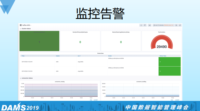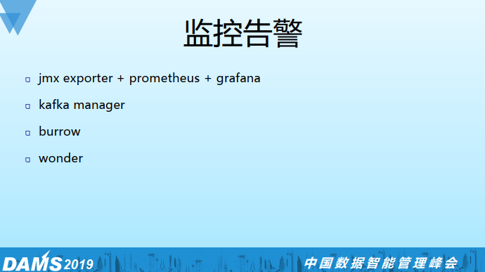 基于 Jmx exporter+Promehteus+Grafana 来做图表展示,在每个 Broker 上面部署 Jmx exporter,Prometheus 会去 Pull 这些数据,最后通过 Grafana 来展示。